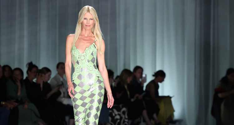 距離Claudia Schiffer上回走上T台已是在 2018年。這位被尊稱為“永遠的真人芭比”超模,與同在90年代出道的Carla Bruni、Naomi Campbell、Cindy Crawford及Helena Christensen一樣為Versace 2018年春夏時裝秀走壓軸;而時隔5年後的今日,Claudia Schiffer獨自上陣,以其一身穿著耀眼的綠銀棋盤紋連身禮服,完美了閉幕這場秀,全身散發出有如真人芭比的耀眼光輝,也征服了在場所有的鎂光燈。