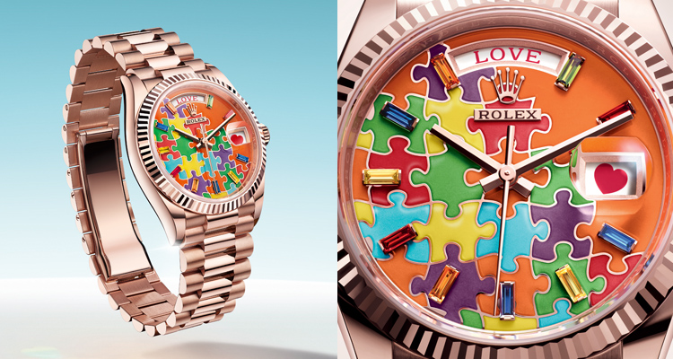 綜觀這一次Rolex(勞力士)全系列錶款新作,除了有「Daytona(迪通拿)」的60週年鉑金版外,最讓人眼睛為之一亮的,絕對莫屬錶盤飾有多彩氣泡「Oyster Perpetual(蠔式恒動型)」及彩色拼圖「Day-Date 36(星期日曆型)」的這兩款腕錶,尤其「Day-Date 36」於機關上的創意,更是別出心裁,品牌特定將原本作為顯示星期的12點鐘位置弧形窗,轉而展示一系列,如:「Happy(開心)」、「Eternity(永恆)」、「Love(愛)」…等鼓舞人心的英文詞彙;更在3點鐘方向的視窗位置,設置如:手機Emoji、大貓熊、生日蛋糕、撲克牌…等多達31種可愛的專屬表情圖騰,以呼應上述詞彙。當配戴者心情不好時就轉一下錶冠、看一下、療癒一下,為自己加油打氣。上述這兩款,當下乍看或許會覺得好不印象中的勞力士啊〜但別懷疑,就是!只能說...勞力士可愛起來,也是凡人無法擋呢~