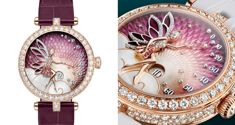 在本次「鐘錶與奇蹟」錶展上,則推出了全新粉紅色款的「Lady Féerie」腕錶,並以詩意複雜功能再次演繹芭蕾仙子的絕色美態:白雲鍍上白色珍珠母貝的虹彩,端坐在雲上的芭蕾仙子身披粉紅色藍寶石和鑽石羽衣;剔透的粉紅色彩繪玻璃琺瑯及不透明的粉紅色琺瑯釉彩,則為仙子的翅膀交織出朦朧漸變的色彩。如夢似幻的“錶現”場景中,芭蕾仙子輕揮魔杖,伴隨著柔和的晚霞,細訴著時間藝術的流轉。