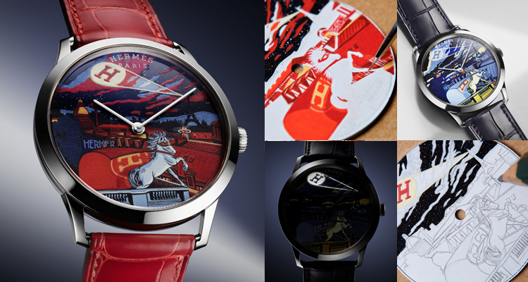 真是太喜歡Hermès(愛馬仕)“玩工藝”了!每次推出的新款腕錶中,也總會期待它們這次又要怎麼將流傳百年的技藝給玩出當代創意、玩出讓常人想像不到的表現手法?而在最近一次釋出的工藝腕錶,則是將絲巾藝術家Dimitri Rybaltchenko於2014年所設計的「絲巾圖案」,與「普普藝術」、「巴黎的世界」這三者不同的元素,在鐘錶工匠們的巧手下,以極為細膩手法予以融為一體。「Slim d' Hermès Minuit au Faubourg 」工藝腕錶上的每個面盤都是獨一無二,皆為完全手工打造:巴黎的場景以手工微縮彩繪而成,其多層次的顏料堆疊,尤其是較厚的「Super-LumiNova ®(夜光塗料)」部分,則又賦予錶盤一種略帶顆粒感的紋理質地,就好比帆布般,相當有趣。究竟要如何將藝術融入時計腕錶?深信愛馬仕給了一個最完美的答案。