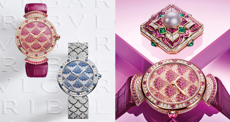 義大利百年品牌Bvlgari(寶格麗)於今年初由母集團LVMH 舉行鐘錶週期間所發表的全新亮點珠寶錶款-「Divas' Dream Mosaica」,光由這一面鑲滿鑽石及粉紅剛玉錶盤的圖騰來看,顯見本季創作靈感,是再次向古羅馬遺跡標的-「卡拉卡拉浴場」致敬。融入浴場上的扇形馬賽克地磚圓弧弧線,柔美、襯膚的玫瑰金版本採用的是淡粉至洋紅色的粉紅剛玉,以深至淺的漸層色調,營造出彷如晚霞天色的細緻變化,再搭飾上相似色調的亮面鱷魚皮錶帶…迷人的寶石、鮮豔的色彩,以及精湛的珠寶工藝,「Divas' Dream Mosaica」可謂是一只充滿活力的耀眼傑作。