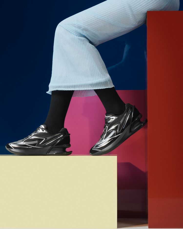 First 系列的高跟鞋,以獨特的懸浮設計創造出獨具風格的樣貌,而此別具風個的特色亦延伸到「First 1」這雙休閒運動鞋上,設計師將倒置的 F 字樣以線條感成線於鞋跟,並將其懸空的元素放置其中,讓該雙鞋款同樣擁有宛如漂浮在空中的感受,而其懸吊的高度下好成為此雙鞋增高的秘密,搭配上收窄的鞋頭,更能延伸雙腿線條。