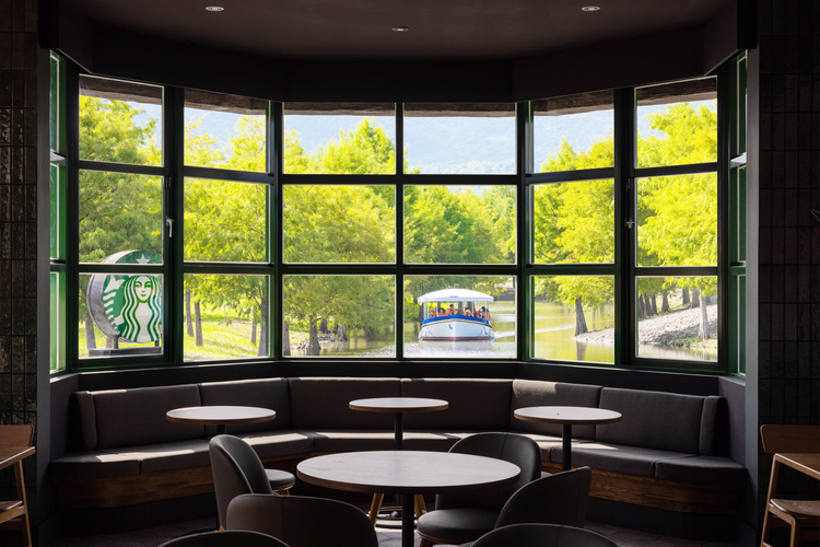 星巴克花蓮理想門市內部設計則以溫暖的中色階柚木色木皮、樸實的六角地磚及冰柱玻璃,營造在歐洲小鎮森林渡假屋的居家感,品牌這次也特別在門市打造多扇大面積的玻璃窗,讓大家在店內也能欣賞四周湖光山色的自然美景,還不時會看到民眾乘坐小船駛過外面的湖呢~牆面也以不少掛畫點綴,一踏進店中感覺時間都放慢了,不論是要享用咖啡或下午茶都超愜意。