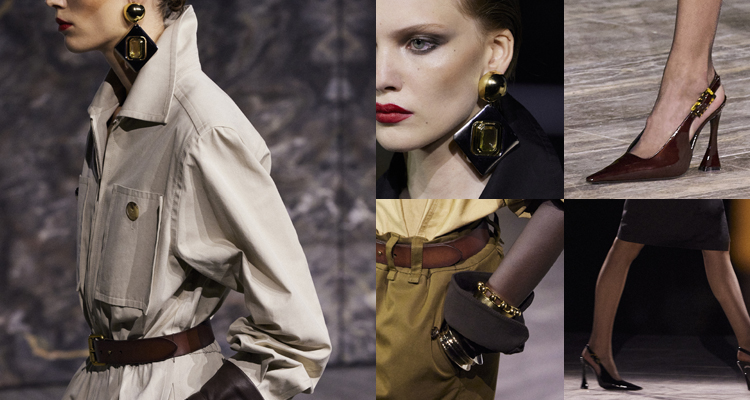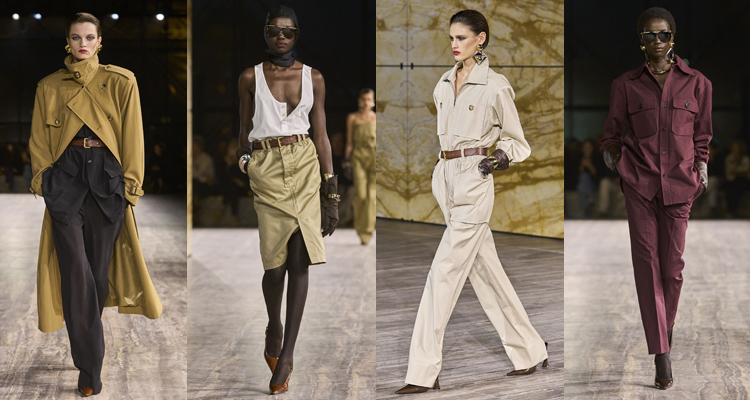 至於材質及搭配上的細節,主要還是以棉與亞麻為面料材質,披上橄欖綠、栗子紅、沙黃及粉白等大地色調,讓穿著者不自散發一抹自然韻致,最後再於腰上緊緊繫上腰帶勾勒出S曲線輪廓,並搭配皮手套、大耳環及高跟鞋…等配飾點綴,使其展現率性之餘,倒也自然增添了品牌予人的精鍊美感。