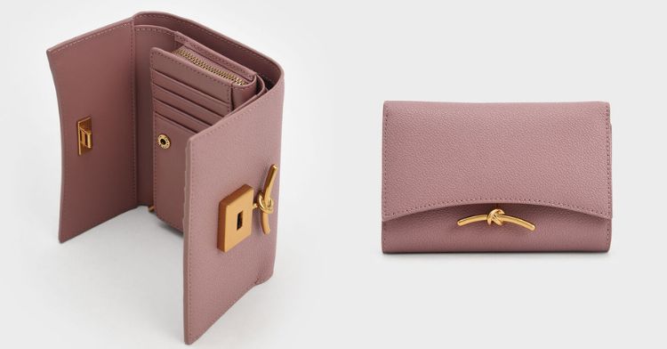 迷人的紫灰色調,裝飾著一個金色的扭結,散發著優雅女人味。偏冷色調的皮夾給人冷靜的氣質,但粉色調又可以給人好氣色與心情,三折式設計搭配內置零錢袋,讓錢包的外型維持在最簡約美好的樣貌。(官網建議售價:NT$ 1,290。)