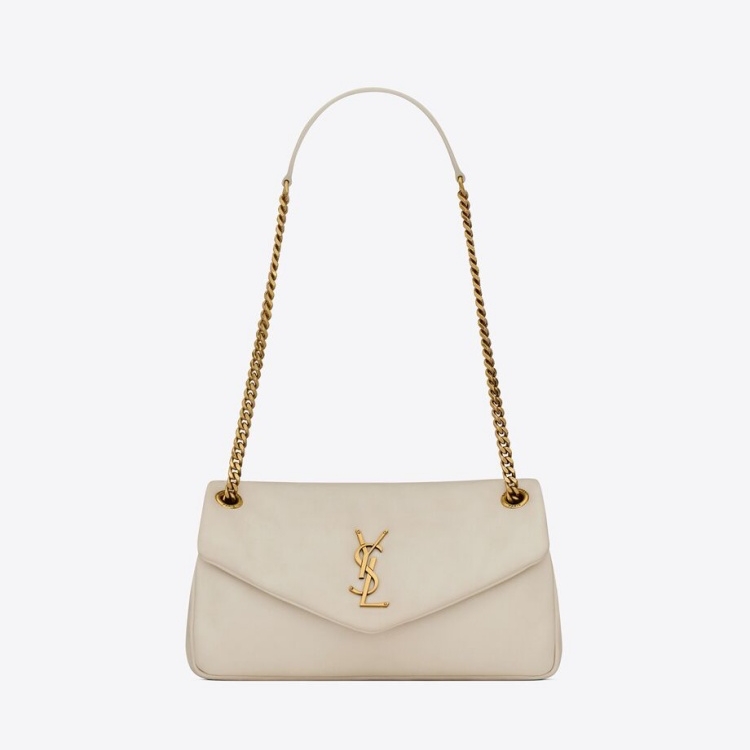 聖羅蘭可不只有凌厲的黑色,也展現出巴黎女人的“柔軟”,像是上圖這一款「Calypso」小羊皮肩背包,裹上一層舒適的奶油白色,搭配上金色五金的點綴,想必帶上它去約會一定能好感度飆升!(價格:NT$90,550)