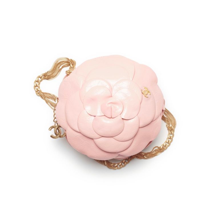 以本季大秀為題,這款晚宴包以山茶花廓形為題,並運用粉色的皮革呈現,透過其柔嫩的色彩展現花朵柔美的樣貌,在背帶的設計上,品牌以多層次的鏈條堆疊,並裝飾上雙 C logo,整體及其吸睛的外型,讓包款也能是搭配的主角。(商品售價:NTD192,900)