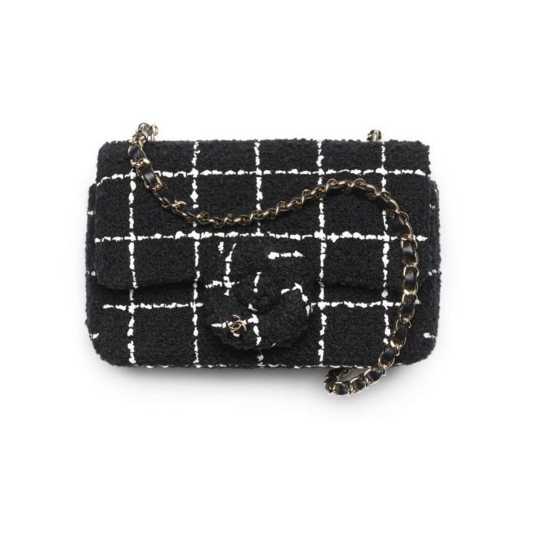 斜紋軟呢是 Chanel 最具代表性的衣物面料,本季品牌將其材質運用在標誌性的口蓋包中,並將其包蓋以本季秀場重點山茶花為點綴呈現,其細膩的面料搭配上優雅的黑白格紋,絕對能讓女孩氣質滿分。(商品售價:NTD182,000)