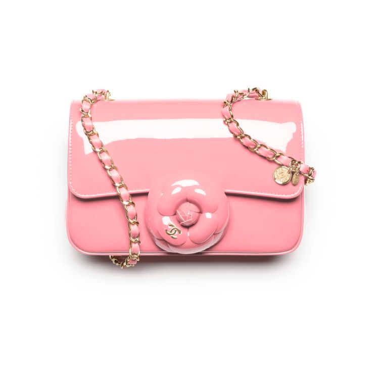 Chanel 的口蓋包一直是女人的夢幻逸品,在本季除了用斜紋軟呢、亮片刺繡呈現外,亦有這款以粉色漆皮打造的包款,甜美的外型搭配上細緻的山茶花裝飾,在鏈帶上更別出心裁的加入了小吊墜,讓整體可愛度衝向滿分。(商品售價:NTD189,300)