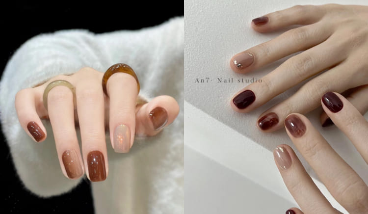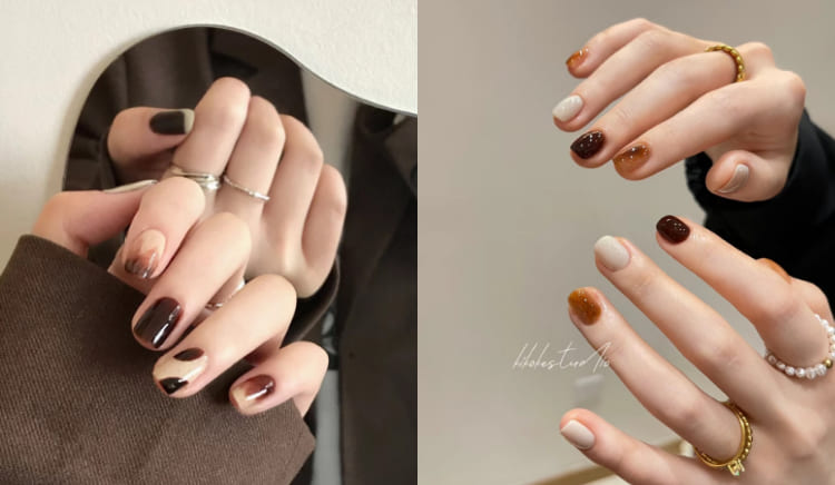 日系女孩最愛的渲染技巧,同樣是今年的造型好幫手!同樣以美拉德色系中的咖啡色、焦糖色作為主角,相襯上奶茶色做出燕麥拿鐵的調色意象,柔軟又兼具女人味;想要更顯白一點,則很推薦與奶白色、白色系跳色混搭,會使美甲造型更明亮有氣色。