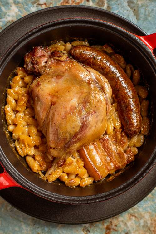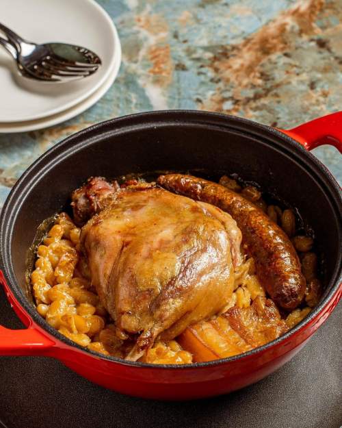 卡蘇萊(Cassoulet)經常出現在法國農村家庭的菜。先熬好豬大骨高湯,再將肥滋滋的五花肉、帶骨鵝腿、自製白酒香腸,各自香煎到滋滋作響,將浸泡一晚的白腰豆煮好後,放一起進烤箱,讓豆子吸附飽滿的肉汁,肉質也變得微酥且軟嫩。值得注意的是,由於這道菜製作費工且耗時,需要提前三天預訂。