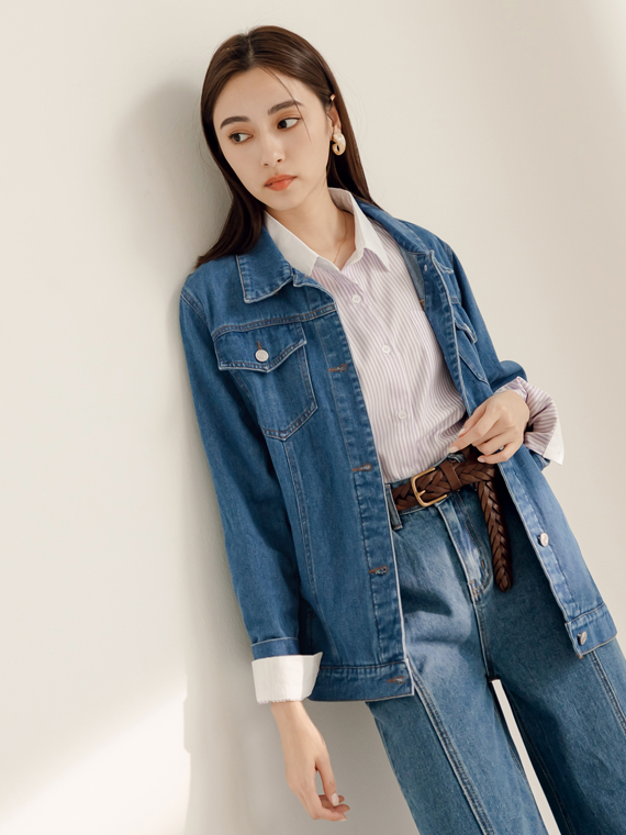 高含棉造型線條修身丹寧牛仔外套選用高含棉牛仔面料,穿著不悶熱十分舒適透氣,自然修身的線條,完全不挑身型,讓你輕鬆打造視覺上纖細身材的效果。復古色調的車線結合多細節設計,加上細膩的排釦及實用口袋,使整體造型感更加提升,是早秋必敗的時髦外套,不買可惜!