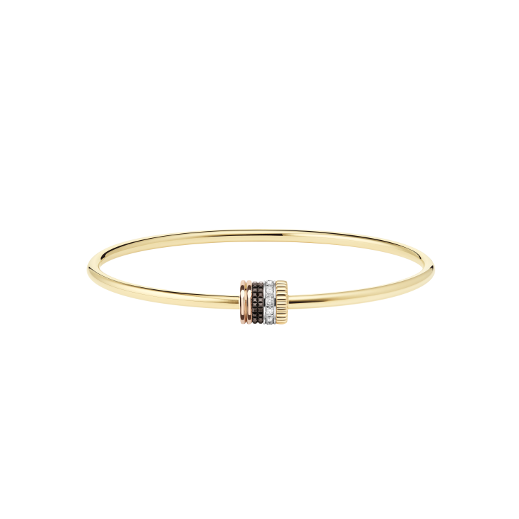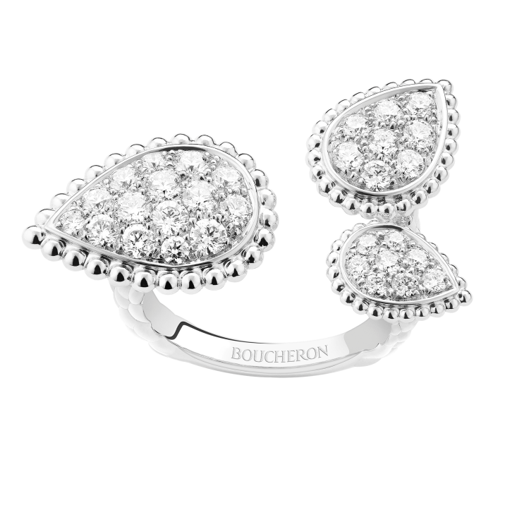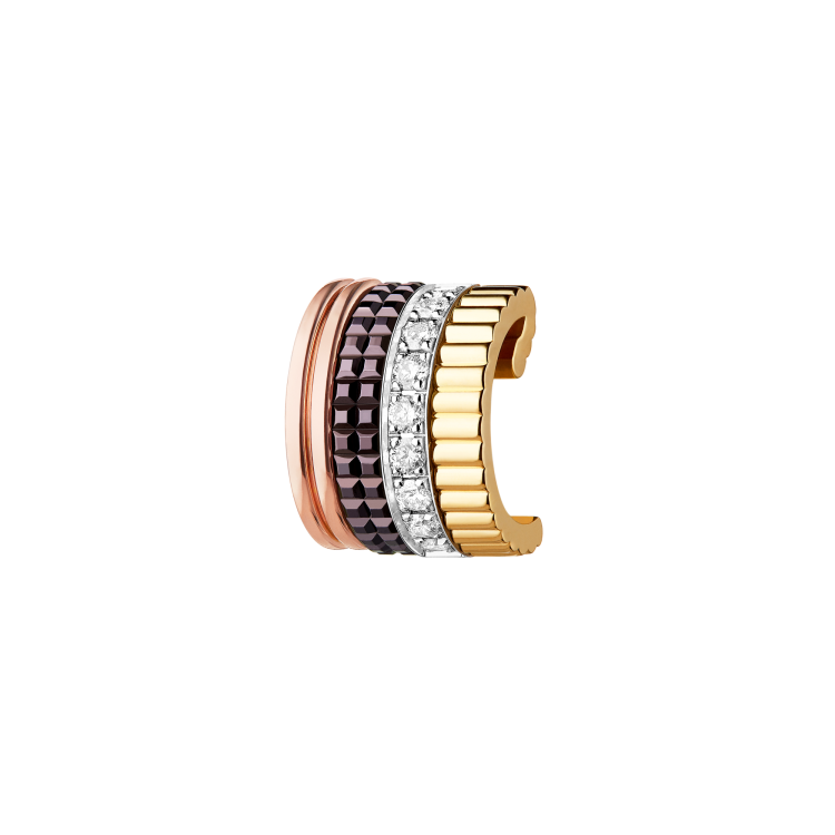 首先來介紹Boucheron的經典系列「Quatre」,簡約俐落的圓弧形,夠過一層層異材質堆疊,展現出具現代的創意設計;無性別之分的中性設計,也成了眾多新人的對戒首選。作品融入了品牌四大標誌性的飾紋設計,包含:羅缎直線刻紋 (Grosgrain)、鑽石圈、雙圈同心圓 (Double Godron) 和巴黎飾紋 (Clou de Paris),同時富有幾何美感與簡潔魅力的作品,不管是穿著正裝或休閒都可以任意搭配。韓劇女神韓韶禧和阿拉伯裔女星Mila Al Zahrani都無法抗拒「Quatre」系列的魅力!