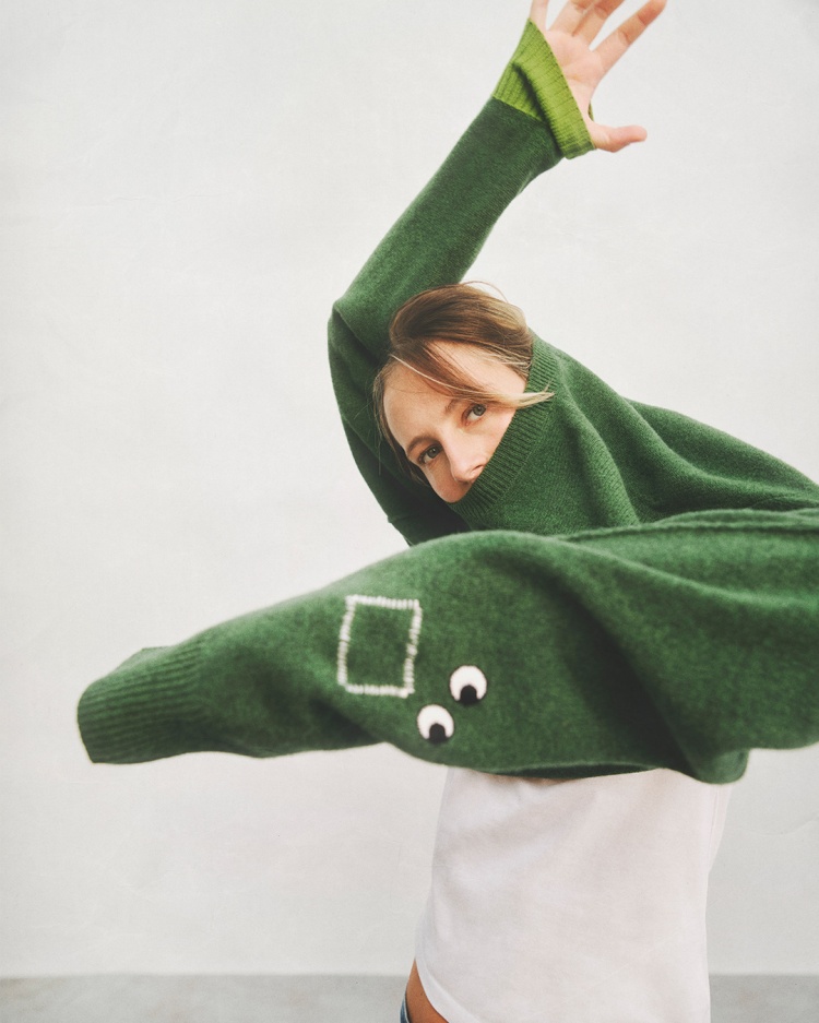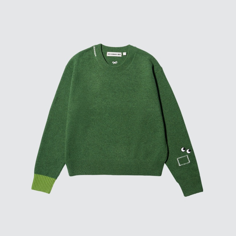 英國設計師Anya Hindmarch原本以包袋、配件的設計為主,這一次與Uniqlo聯名,便有一款圓領的毛衣,其中深綠色的這款最是深得人心,領口與袖口的縫線設計,加上最著名的「小眼睛」,可愛度+100分!(價格:NT$1,290)