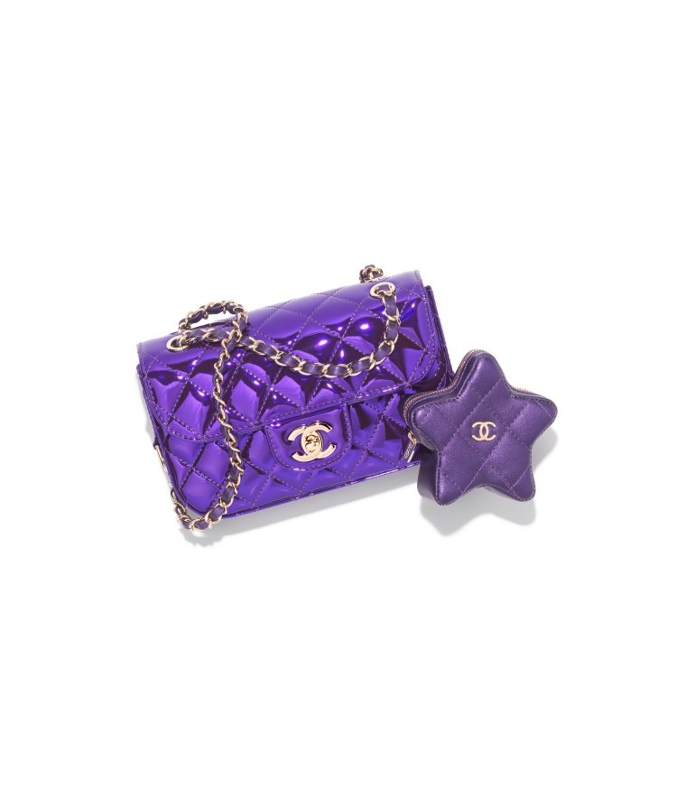 不只有黑色、金色、銀色,屬於LA Girls的辣妹感一定需要來點大膽的用色,比如說超級亮麗的紫色鏡面小牛皮包裹住經典的菱格紋口蓋包,一旁再掛上相對霧面的星星零錢包,哪個女人能夠全身而退?(價格:NT$207,500)