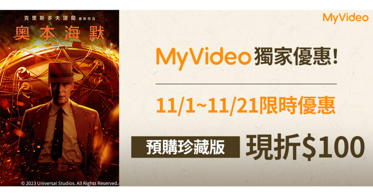 MyVideo「單點強檔」11月20日上架名導諾蘭神作《奧本海默》,以二戰原子彈之父為題,11月21日前預購珍藏版只要489元(原價$589);11月22日至12月5日購買抽《奧本海默》套書。強片推薦《GT:跨界玩家》遊戲宅男翻身成為賽道王者;DC超級英雄《藍甲蟲》描述大學生獲得外星超能力打擊犯罪;小朋友最愛電影版《汪汪隊立大功:超級大電影 搶先版》。11月30日前選看阿湯哥《不可能的任務:致命清算 第一章》有機會帶回連帽上衣;觀賞《魔髮精靈》、《功夫熊貓》、《寶貝老闆》等夢工廠動畫,就抽《魔髮精靈:樂團在一起》電影交換券。