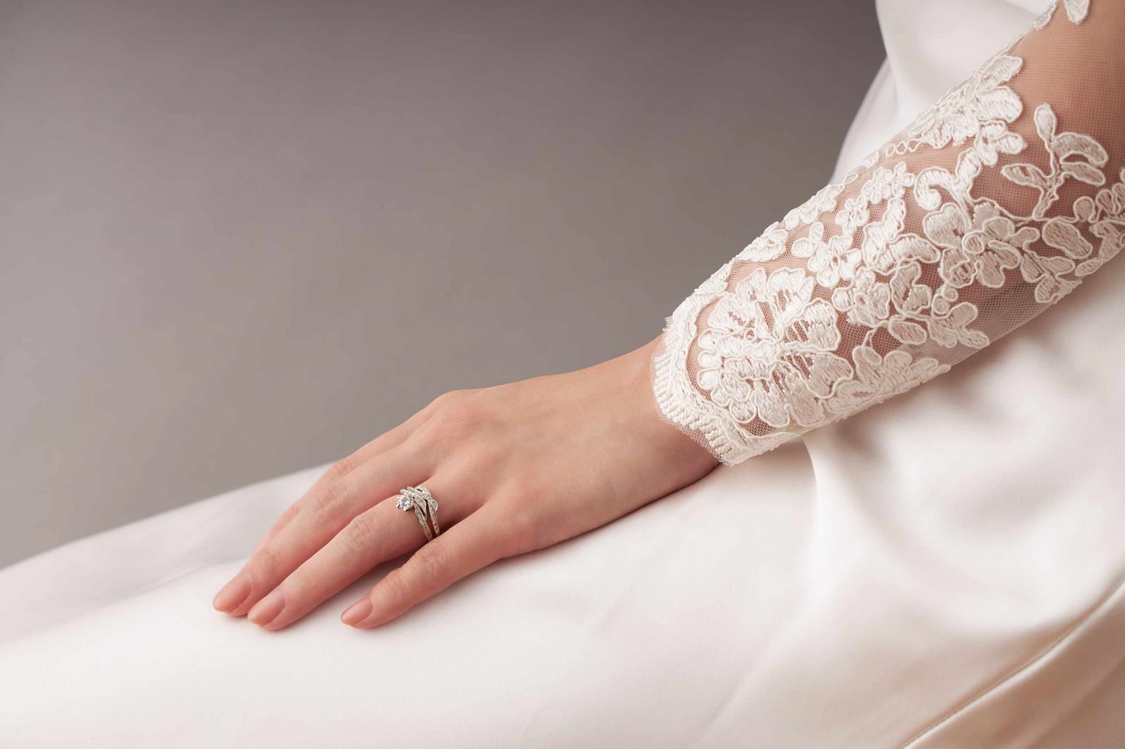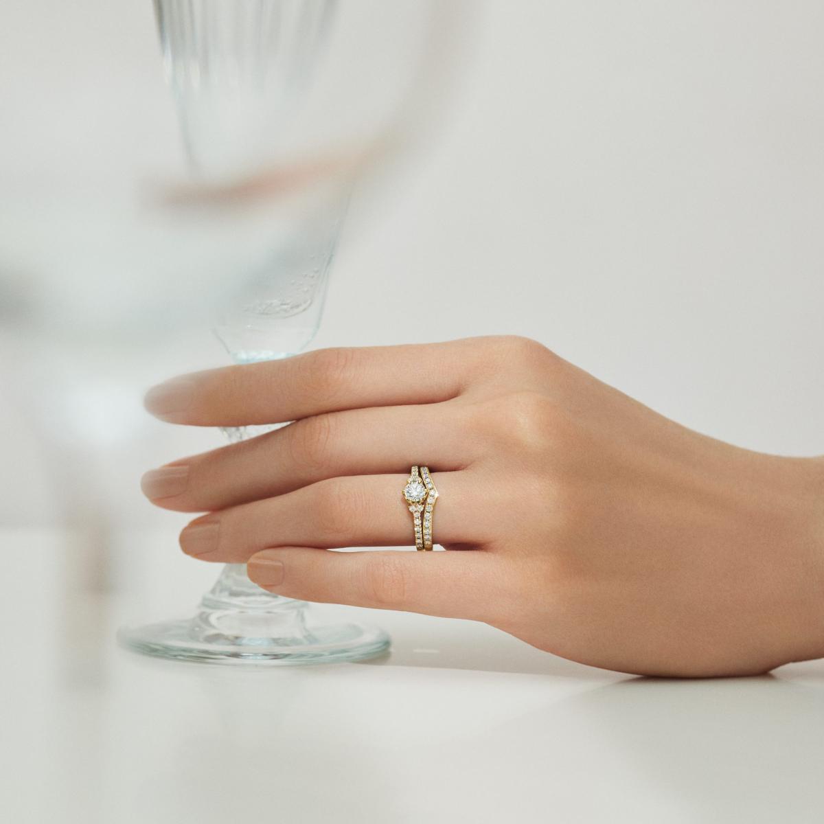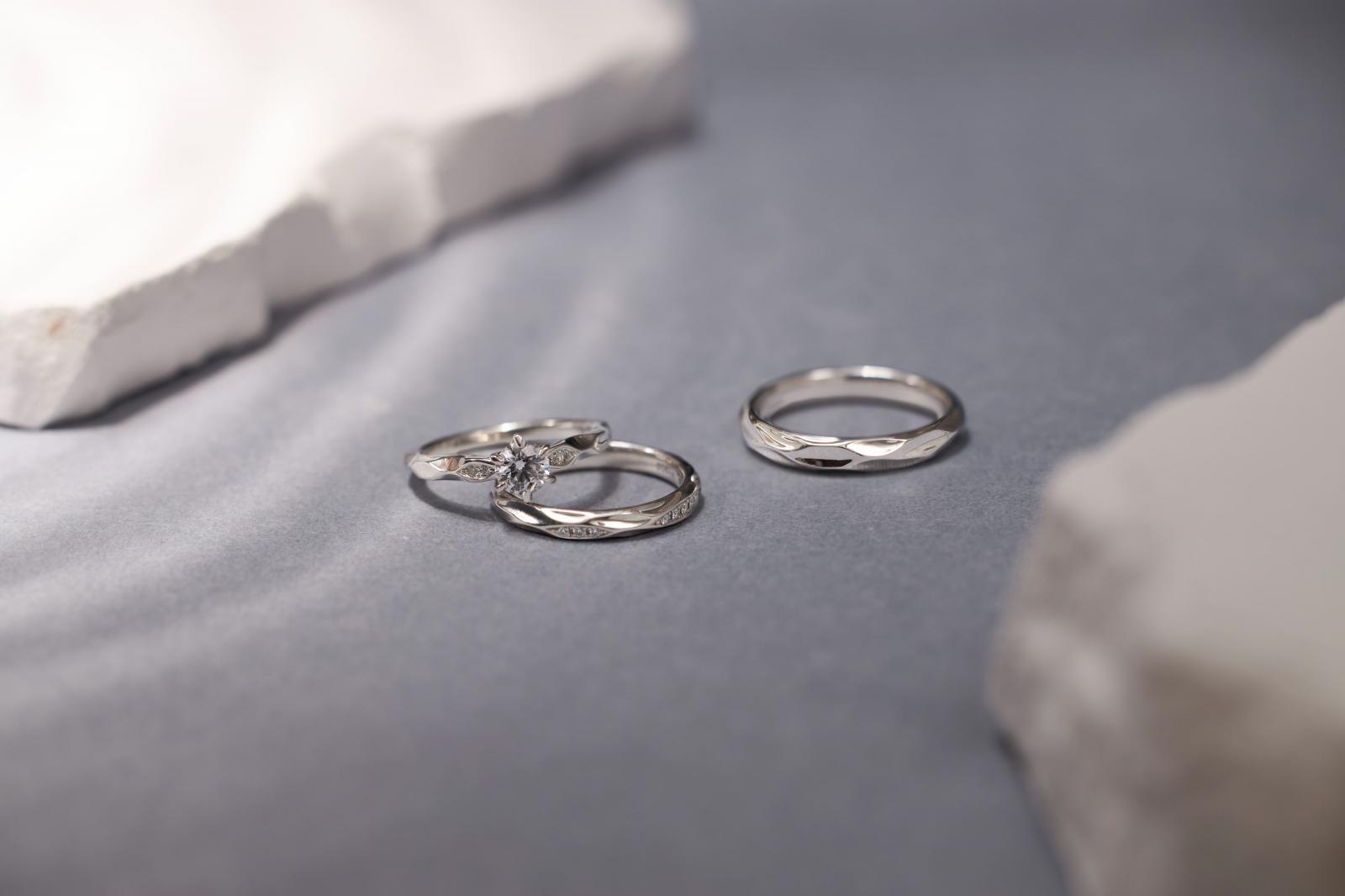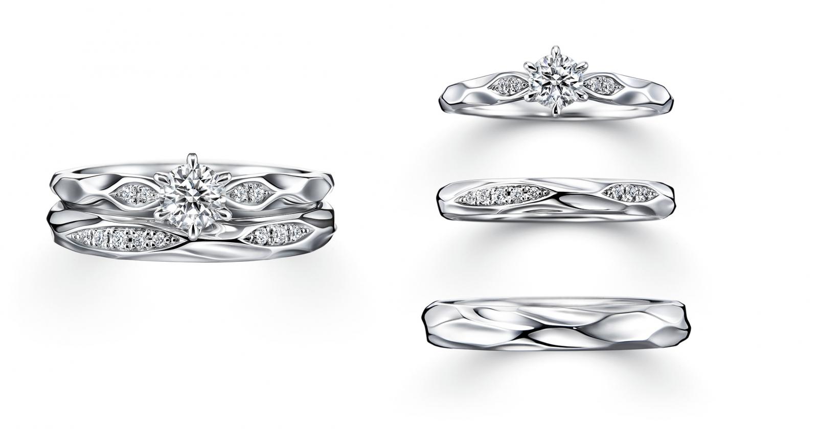 被太陽照耀下,波光粼粼的水面藏有戀人漫長且熠熠生輝的愛情與誓約。「水之綾MIZUNOAYA」結婚對戒同樣是I-PRIMO初空系列深受戀人喜愛的款式。此系列獨有的河川紋理,擁有著閃爍搖曳的波光,如同幸福的日常,伴隨著漣漪一圈一圈蔓延。另外本次冬季新款也推出「水之綾」系列的訂婚鑽戒款式,同樣以水波紋作為設計理念,纖細的戒環既優雅又具有生命力。鑲嵌的主鑽同樣綻放出細緻的光芒,如同陽光照射在戀人間漫漫的河流,平穩且幸褔。疊戴搭配時直線型的戒環能夠完美重合,相互輝映兩只戒指的波光,成為既低調又充滿細節的一套結婚套戒。