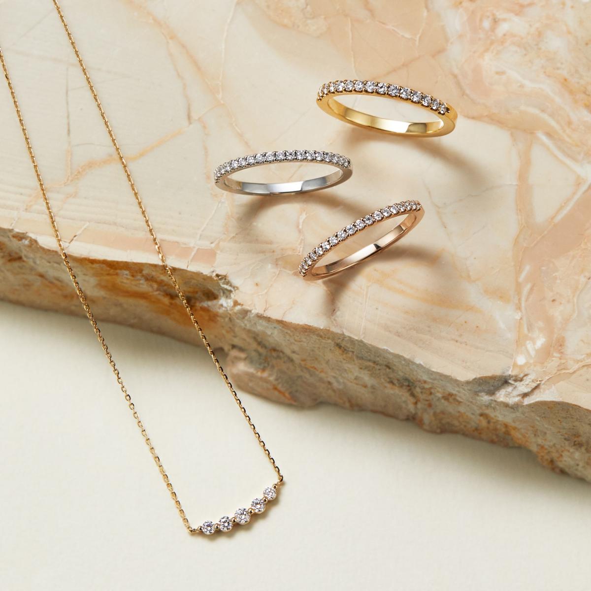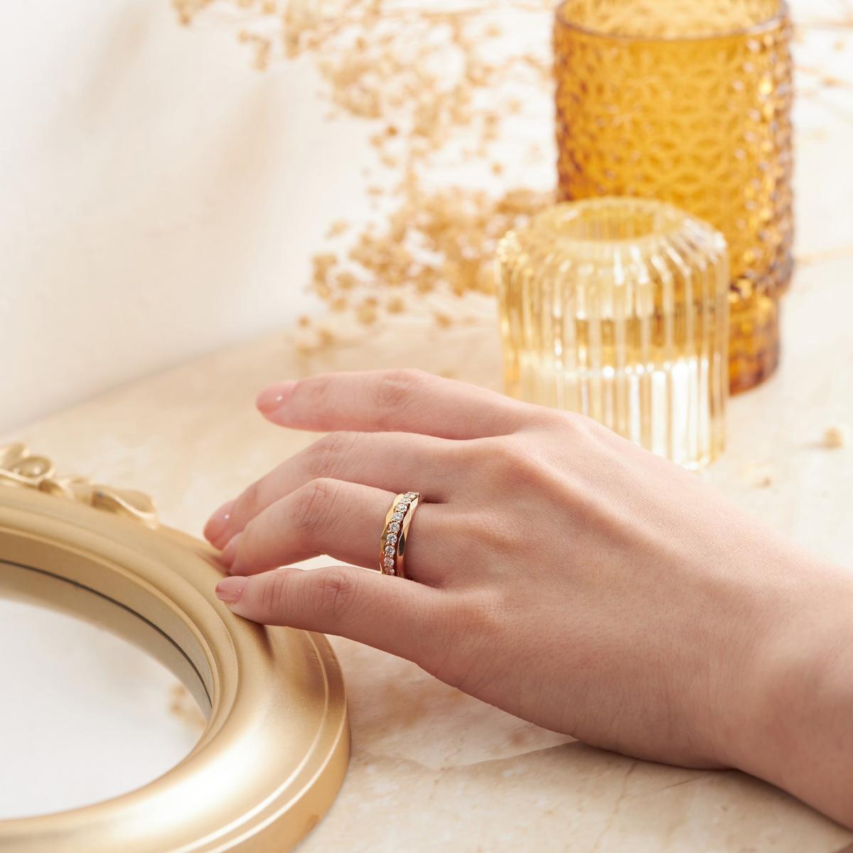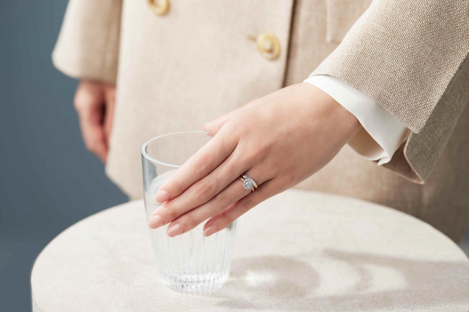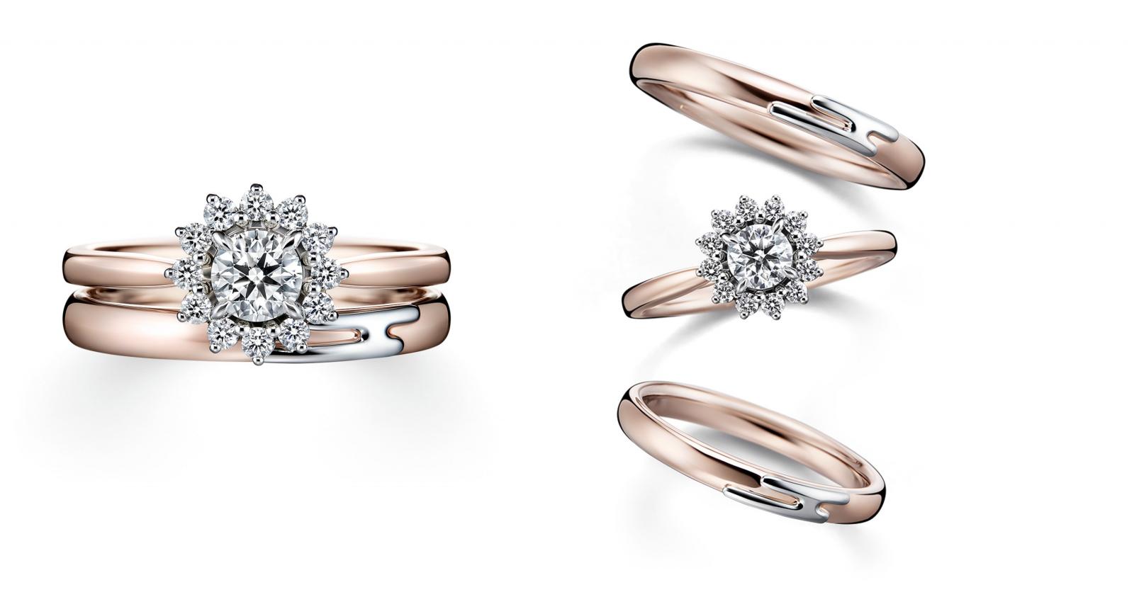 「初明HATSUKARI」訂婚鑽戒,擁有象徵元旦日光的閃耀鑽石,與被陽光浸染的溫潤玫瑰金戒環,兩者相互映照,閃爍著細緻的光輝,猶如莊嚴的日光,照亮與伴侶新階段的美好開端。以配鑽環繞主鑽詮釋「初明」的元旦拂曉時分、太陽緩緩升起的模樣,配鑽更採三爪鑲嵌,其中一爪配置於外側,藉此演繹太陽和煦卻光芒四射的意象。