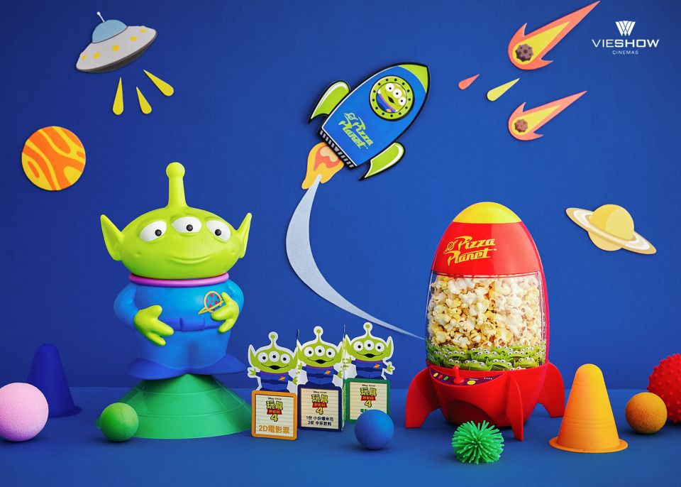 威秀影城於6月6日限量上市的「比薩星球收藏套票」中包含了2張2D《玩具總動員4》電影票、1個火箭造型爆米花桶、1個火箭造型電影票夾、1個小份爆米花與2杯中杯飲料,內容物精緻又超值。