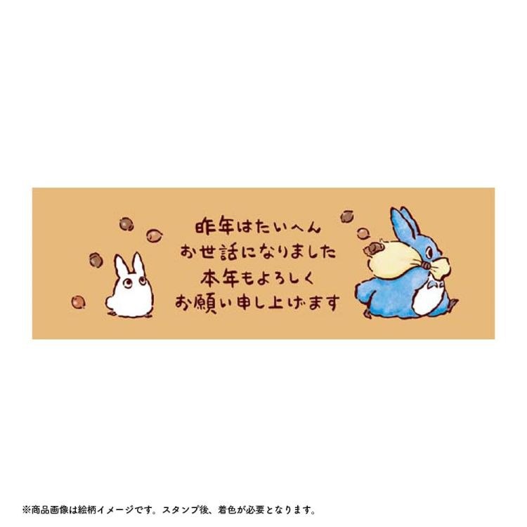 另一款郵票上,則是印上龍貓造型的雪人,上面寫著「很高興認識你」,還有一旁可愛的灰塵精靈,整體畫面看上去療癒性十足。另一款,長型郵票上逗趣寫下:「謝謝你去年的幫忙,今年也希望你多多幫忙。」搭配俏皮的小龍貓,以及灑落的一粒粒橡實,更顯一抹幽默感,好像來年還是會繼續給人惹麻煩。