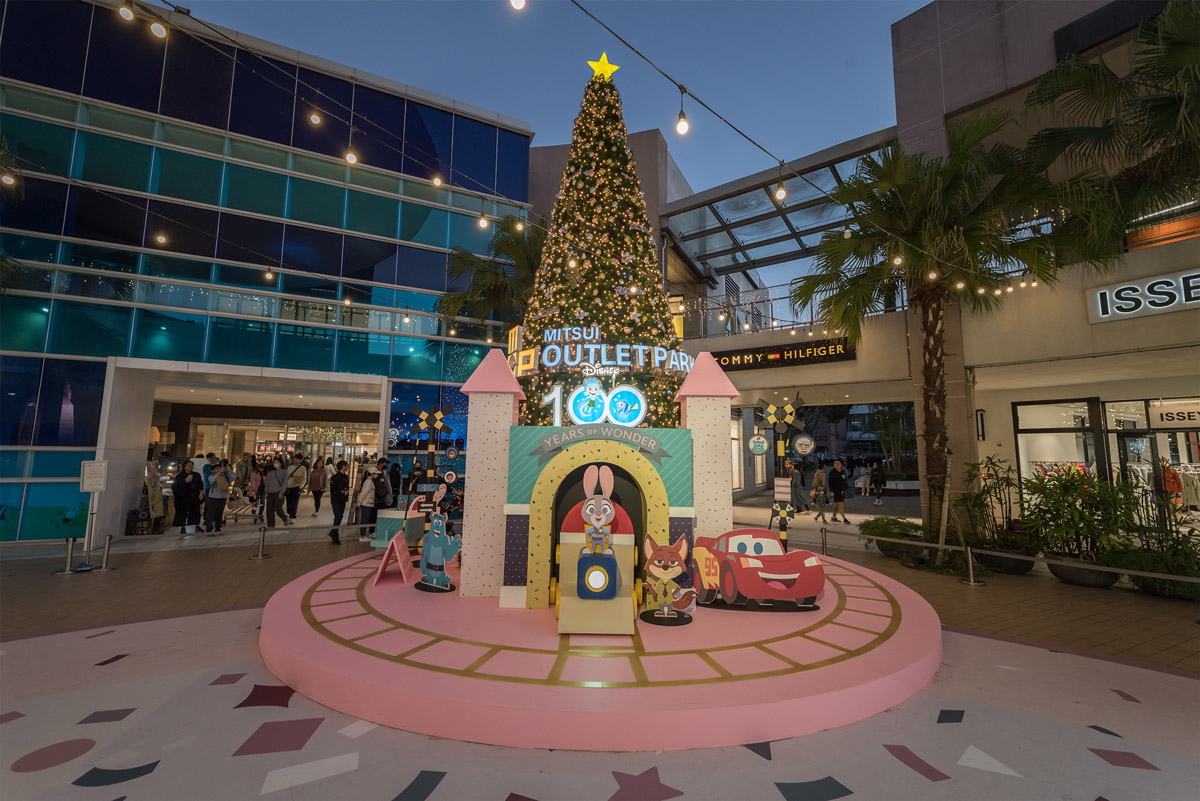 適逢迪士尼100週年盛典,MITSUI OUTLET PARK 林口於是在中央廣場打造一座迪士尼角色聖誕樹,《動物方城市》的茱蒂與尼克、《玩具總動員》的毛怪與《汽車總動員》的麥坤等全化身裝置,而在廣場周邊更有以迪士尼公主和經典動畫角色打造的造景燈飾,各個讓人童心、少女心噴發,適合一家大小來此度過歡樂時光。