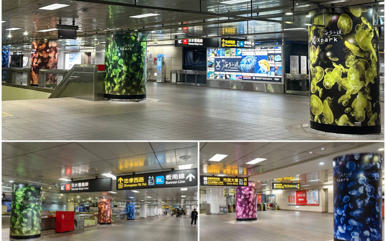 Xpark館內打卡熱點之一「癒見水母」,以多彩繽紛的水母圓柱水槽亮麗現身於台北車站(B3層捷運紅線/台鐵高鐵轉乘區),為繁忙急促的通勤上班日常注入一股如釋重負般的悠游感,無論走過路過都能近距離來一段Xpark療癒體驗。