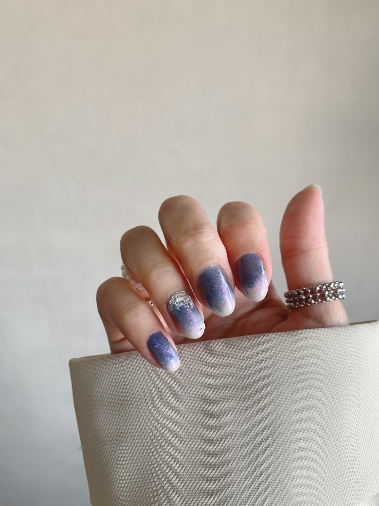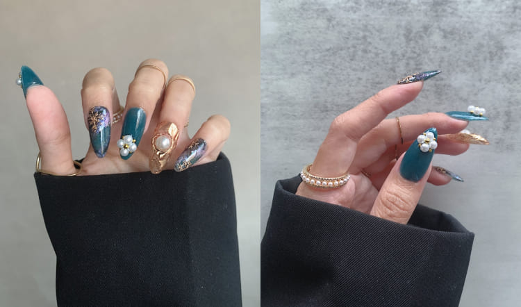 藍色系也是今年備受矚目的色彩之一!尤其帶點古典韻味的土耳其藍,更常見於日韓美甲的文化中!今年不光可以透過土耳其藍搭配美拉德色系做跳色拼接,更推薦運用珍珠、金屬裝飾去點綴出奢華珠寶感,不僅在派對季很亮眼,應對日常穿搭也不失誤!