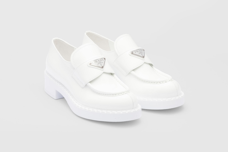 說到樂福鞋怎麼能忘記Prada!這個漆皮的款式,以亮眼的全白為主色調,點綴上經典的三角鐵牌,圓滑的鞋頭與五公分厚度的鞋底,搭配上亮色系的西裝套裝,在城市街頭回頭率大漲!(價格:NT$40,000)