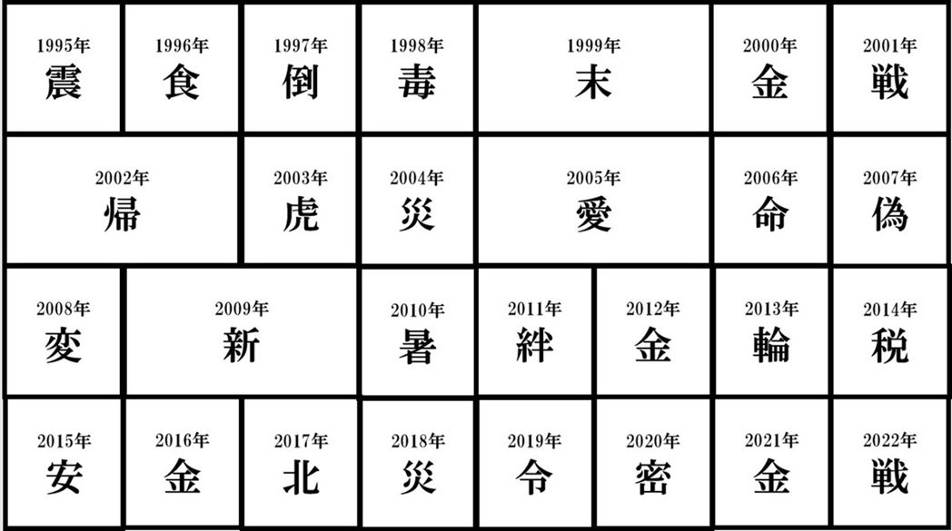 年度漢字都反映了當年的大事,像是2022的年度漢字則是「戰」,因應烏俄戰爭的開打。2021年的年度漢字「金」代表東京奧運會順利開辦,以及日本隊獲得史上最多獎牌數等意涵。而其中也有不少漢字是數度當選,像是「金」、「災」,都因為遇到了相似的情況而多次當選,今年的「稅」也曾是2014年的年度漢字,當時日本政府調漲了和民生需求最息息相關的消費稅,同樣引發了人民的不滿。