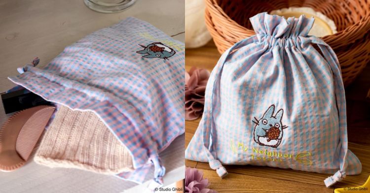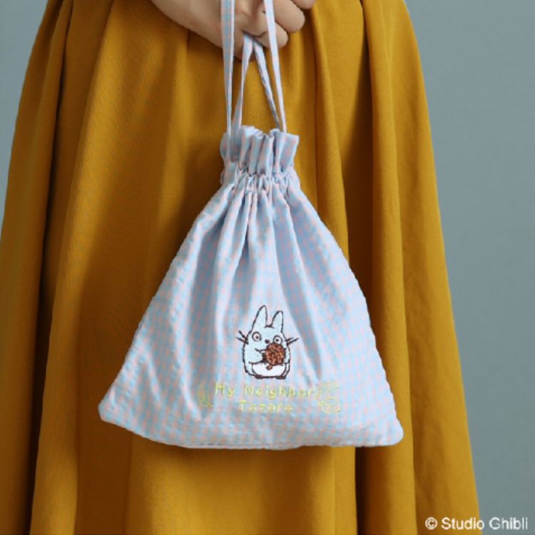 除了多功能隔層托特包,另一款「藍格刺繡束口袋」也在這次快閃店販售。柔軟的棉料材質,搭配淺藍色和粉紅色的格子,藉由抽繩的靈活設計,讓這款小包變得更加俐落、易於收納。最可愛的,莫過於中間有一隻中型的龍貓,牠拿著一顆松果好似祝福般,讓拿到這個束口袋的人應該也會變得幸運吧。