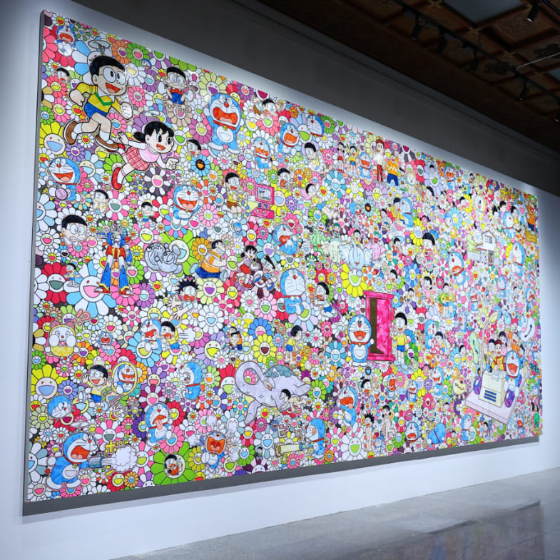 在藝術界及潮流界都頗具盛名的村上隆這次負責展覽主視覺,以「這樣的事情真好 能實現的話更好」為靈感,結合他的代表作《花》與《哆啦 A 夢》,一入場就會可看到高 3 公尺、寬 6 公尺的巨幅畫作,在五彩繽紛的花朵中還蘊藏了許多漫畫的著名場景、角色及道具,仔細找找還能找到藤子.F.不二雄老師的身影喔!
