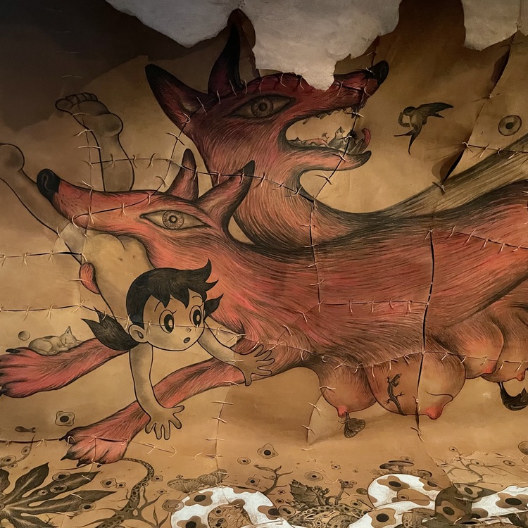 不少網友喊話必朝聖的「靜香的洞窟」則由藝術家鴻池朋子,以皮革創作出高 5 公尺、長 12 公尺的畫作,會以靜香當作主角是因為她認為在哆啦 A 夢中靜香是唯一的女性,與其他角色比起來有多了一分距離,至於使用皮革也是她認為皮革比起其他媒介更多了一分溫度,才有了如此吸睛的作品。