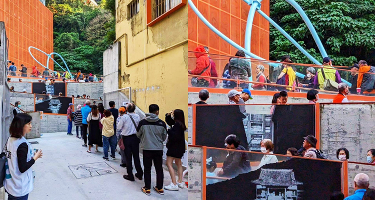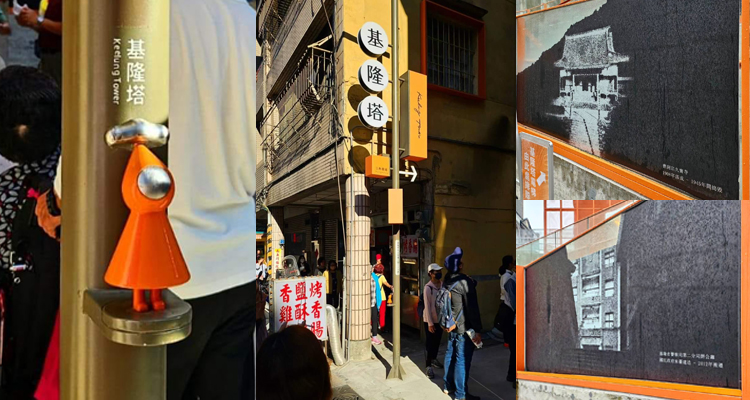 排隊的入口處設有專為「基隆塔」設計的文字Logo招牌及可愛雨傘人裝置;而在無障礙斜坡的牆面上,也分別貼上過去於日治時期的「曹洞宗久寶寺(1908落成-1945年間搗毀)」及「基隆市警察局第二分局舊廳舍(國民政府來台建造落成-2012年間搬遷)」的故址黑白照片,彷彿在通往今日2023年的「基隆塔」前,得先讓人好好回憶時光的美好歲月。難忘當年甚小的我,還曾因為過於好奇,有走上又斜又陡的灰色階梯,然後抬頭一看那橘紅色磁磚砌成的警局外觀,簡直高聳氣派極了。