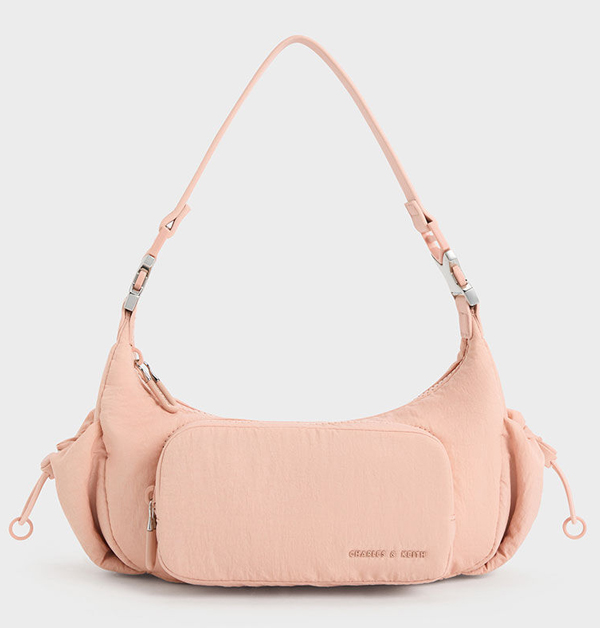 同系列的粉紅色款「Soleil」尼龍肩背包,優雅流線弧形能自然貼合身體,配上側邊抽繩口袋與前方拉鍊袋設計,功能性更升級。(NT$ 2,390元)