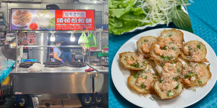桃園是全台灣移工最多的城市,所以桃園夜市也吃得到蠻多道地的東南亞美食,像這家賣的就是越南傳統小吃煎蝦餅,將大顆鮮蝦裹粉炸過後,撒上蔥花跟蝦鬆,店家會再附上一盤生菜跟青木瓜絲,正確的吃法就是用生菜夾著其他配料,最後再沾魚露醬跟生辣椒一起入口,麵皮的酥脆、蝦的鮮甜跟酸辣的口感直接在嘴裡擴散,真的超享受!而一份有八隻蝦卻只要 120 元這個 CP 值真的不推不行!