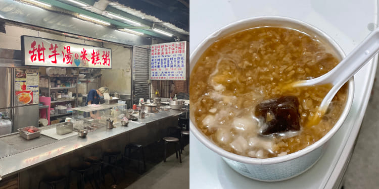 吃完鹹食來推薦甜品吧!又是家懶得想店名但是卻上過不少美食節目的名店,主要販賣綠豆湯、花生湯、甜芋湯、米糕粥、燒麻糬...等古早味甜品,夏天還有四菓冰,而招牌絕對是加了綿密芋頭的米糕粥啦!煮到濃稠的米糕粥吃起來甜而不膩、入口即化,吃了幾口還會發現添加了桂圓跟少許米酒,整碗湯吃起來更有層次,加入軟硬與甜度都恰到好處的綿密芋頭真的超享受!如果還有胃的話,John 編也很推薦可以點 Q 彈不黏牙的花生粉燒麻糬喔!