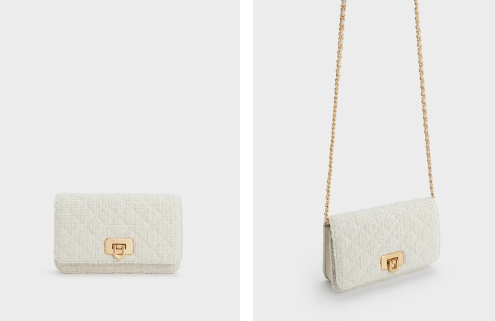 包包在穿搭中也是不可缺少的重要角色,Cressida鍊條手拿包採用秋冬感的毛呢布料,搭配冬衣再適合不過!CHARLES & KEITH這款可以把鍊條放到包包裡,就成了手拿包,也能拉出鍊條來肩揹,一咖包滿足兩種造型。鍊條手拿包有出到7個顏色,就依照衣櫃裡的衣服色系來選購吧!