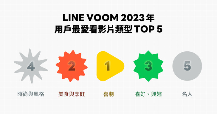 LINE VOOM年度排行榜中,以「喜劇」最受歡迎,據統計,用戶全年投入高達2億分鐘,在平台上觀看輕鬆搞笑影音;緊追在後的是讓人食指大動的「美食與烹飪」影片,而「喜好與興趣」影片,也登上用戶最愛類型第三名,不論是手作工藝,或是冷門科普,都有不同觀眾喜愛。