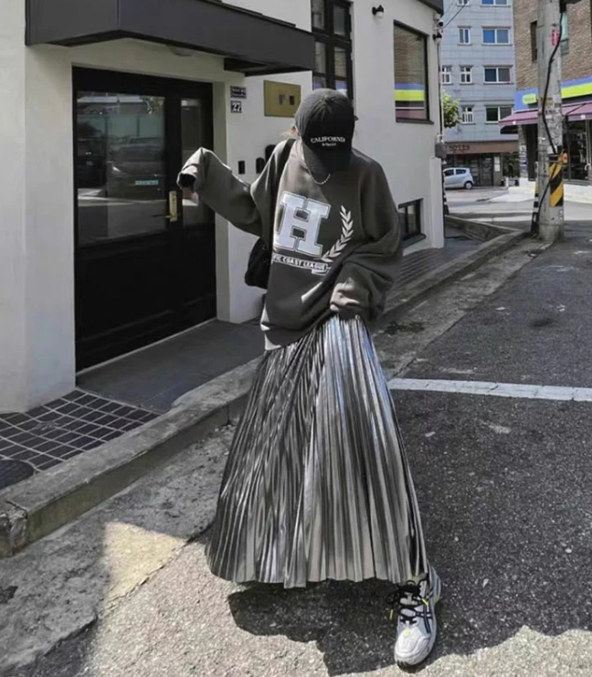 冬天好想穿裙子又怕會很冷?喜歡穿裙子的女生,在寒冷的冬天裡就來件百褶長裙吧!百褶裙長度夠,裡面穿貼身發熱褲也不會被發現。日常穿搭就搭配厚磅大學棉T,保暖又帥氣,衣服色系可選擇黑、灰、白基礎色,簡單打造酷甜Style。ANNAS閃耀的銀色百褶長裙,讓整體的穿搭更加個性、有亮點。