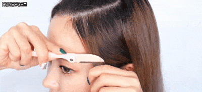 STEP2.取一小撮髮絲,用修眉刀或小剪刀從眉尾的位置開始修剪,打造短到長的層次感