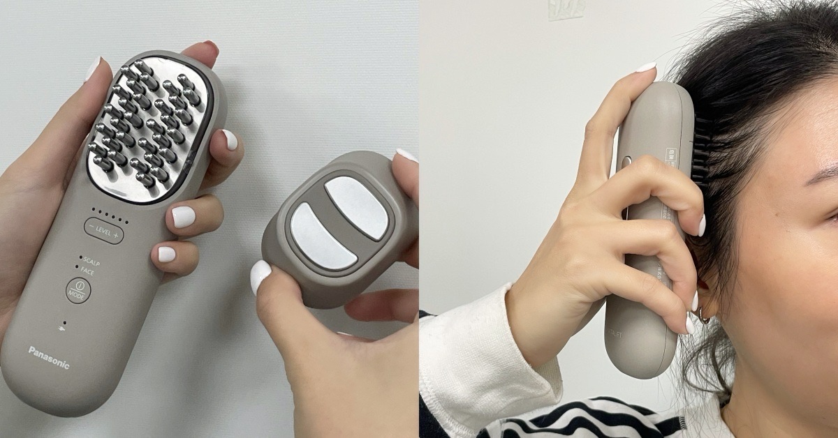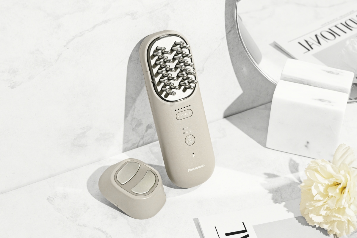 除了「離子導入美容儀EX EH-SS85」之外,另一款連日本美容大使_田中美奈實都搶先使用的新品「EMS梳型美容儀EH-SP60」,這款可以說是地心引力的剋星,機型的外觀形状、大小和梳齒結構都經過縝密的思考與設計。這是儂編第一次體驗頭部類型的美容儀,浮動式的32個梳齒,有點像氣墊一樣貼合頭部,過程中就像蓋印章一樣,在慢慢梳動的過程中,透過EMS的傳導來訓練頭側肌肉,從頭部開始牽引著臉部線條,一起達到拉提及緊實效果,此外,最令儂編驚豔的是他具有防水功能,所以洗澡時也能搭配使用,效果一定更加倍!