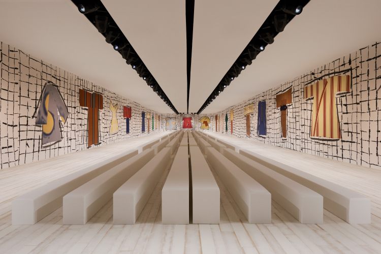 自 Maria Grazia Chiuri 入主 Dior 後,以女性為核心的精神不僅藏於服裝,更體現在品牌設計中。Dior 2024 春夏高級訂製服系列,搜集頂級紡織品、古董面料為創作的藝術家 Iebella Ducrot 成為本次設計的起點,出生於義大利納普勒斯,對於布料的愛好與偏執,成為 Iebella Ducrot 走訪全世界各地的動力,中國、印度、土耳其和中亞都曾是她研究布料時的所前往的國家,本次的大秀伸展台,她便以《Big Aura》的藝術裝置為主軸,經緯交織的線條與服飾圖樣的搭配,像是紡拓機織布的意象,而這個對於面料玩味的詮釋方式,間接啟發 Maria Grazia Chiuri。