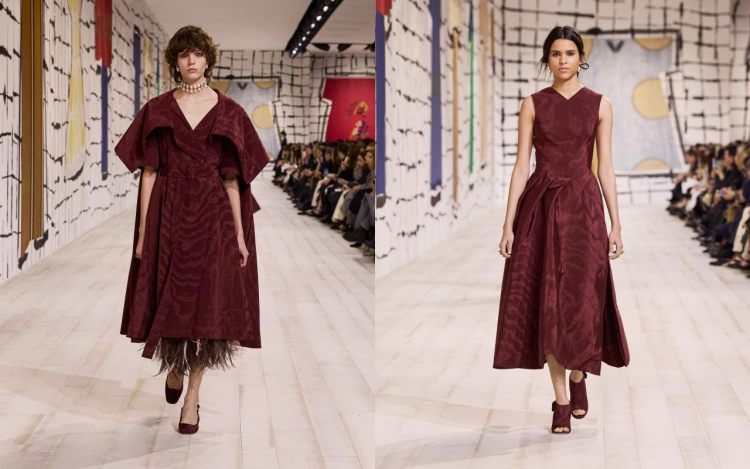 除了在服裝線條上致敬「La Cigale」這件禮服,同時 Maria Grazia Chiuri 在布料的處理上則使用雲紋綢為主軸。雲紋綢料在製作上需運用加熱壓製,不斷對布料做拋光,進而讓面料在行走時能折射出如雲彩般的紋理,此技法 1952 年時便運用於「La Cigale」這件禮服上,在半世紀的時間過後,Maria Grazia Chiuri 已更為細膩的紋理呈現在本季的高級訂製服上,對於精緻面料的運用,同時也能扣回本季操刀伸展台的藝術家 Iebella Ducrot 的作品中。