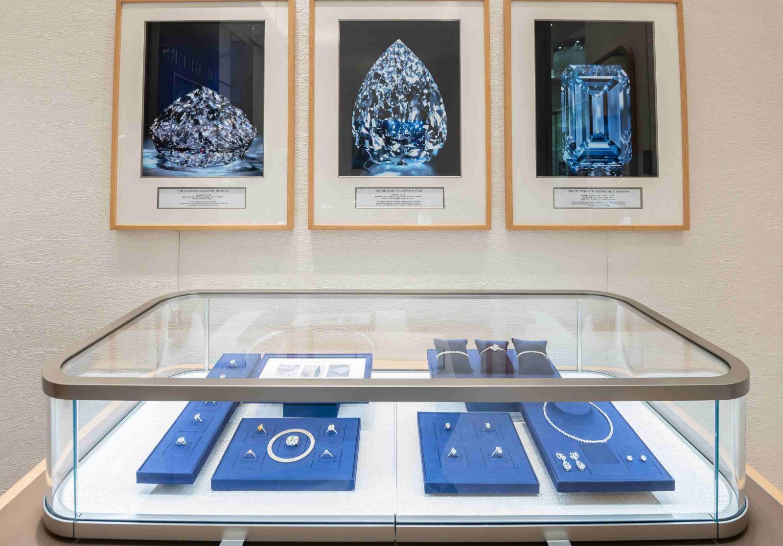 De Beers全新精品店選址於台中大遠百,外牆設計沿用品牌經典深藍色,店內則採用優雅靜謐的金色、灰褐色和藍色調裝飾,每一款材質、擺飾、傢俱皆是精心挑選,並選用De Beers 的標誌性色彩,極致彰顯品牌的奢華經典。而「建設永恒」(Building Forever)是品牌永續發展的核心理念,在全新精品店也不例外。店內引入了一套複雜的照明系統,能完美突顯每顆鑽石無與倫比的生命力及光彩,同時也能符合嚴格的耗能規範,另外店內的每一個設計也都確實遵循永續理念,讓鑽石璀璨閃耀之餘也減少對環境的影響。