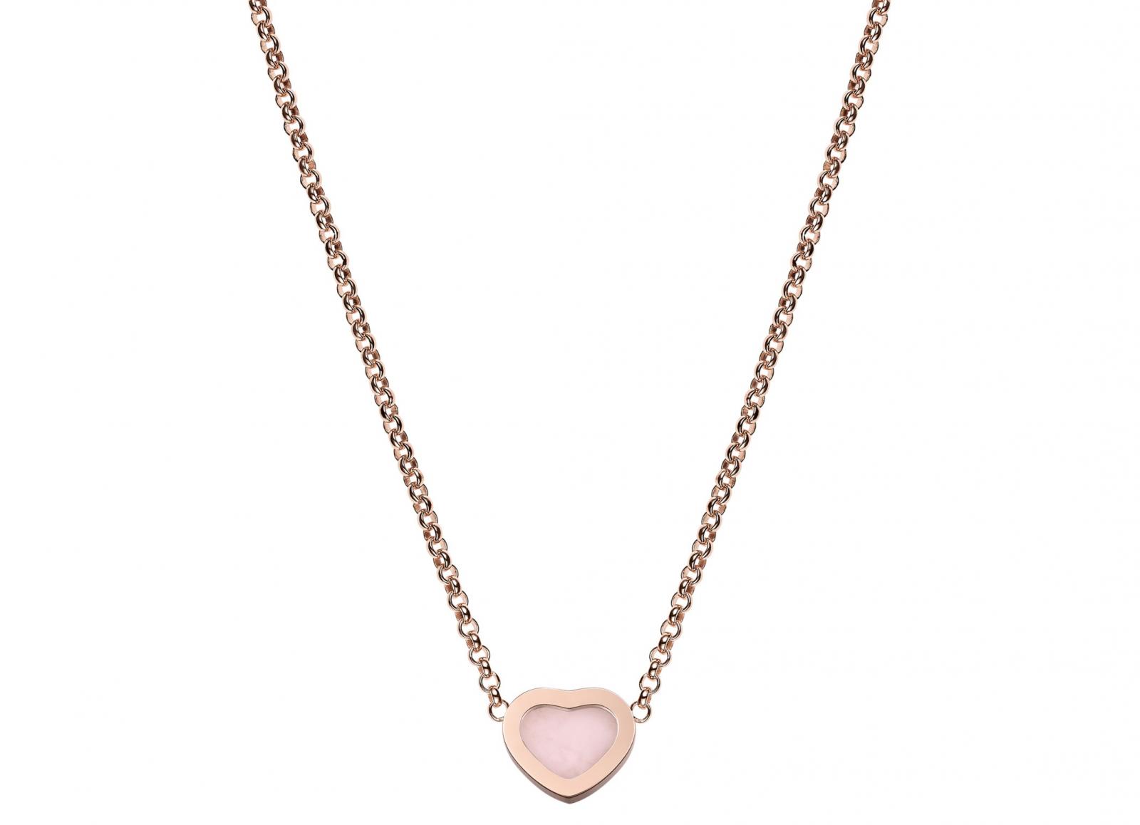 Happy Hearts系列項鍊,符合倫理道德標準的18K玫瑰金飾以粉紅蛋白石與鑽石鑲嵌,搭配單顆滑動鑽石。