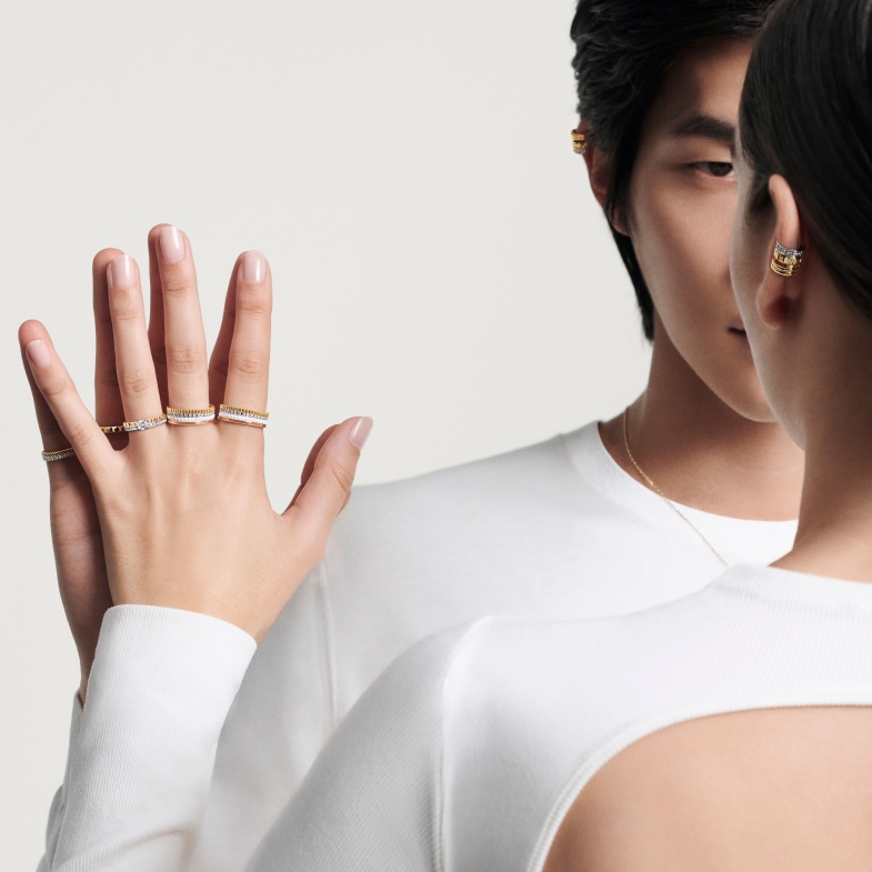 品牌中較為中性的「Quatre」系列,四層不同設計與材質的堆疊,包含陶瓷、羅缎直線刻紋(Grosgrain)、雙圈同心圓(Double Godron)、以及巴黎飾紋(Clou de Paris),每一層都有獨特含義,陶瓷的光滑面與異材質的搭配,提亮了整體細節。此外,「Quatre」系列更是一個靈活度很大的珠寶,除了備有四層的作品,更提供一層及雙層的選項,可以根據節日選購,為每一層賦予不同意義。其中,「Quatre Radiant」系列今年更推出兩枚突顯巴黎飾紋元素設計的戒指,再次強調其獨特且無可取代的風格。