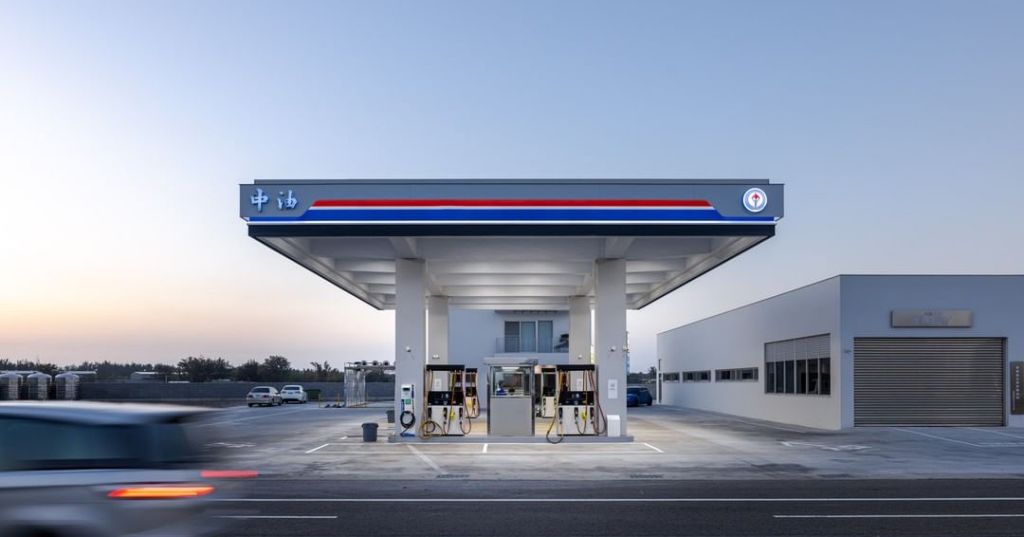 然而,在設計上,建築團隊並未全然改變,延續台灣中油的標誌,將其 Logo 放置於建築頂一隅上方,畫上白、紅、藍直條色系。透過「鈦白」與「霧銀」的輕盈材質,弱化建築物的厚重感。在白天時,顯得明亮寬敞;在夜晚時,呈現沉穩內斂,以「漂浮、透明」作為靈感主軸,讓加油站變時髦了。