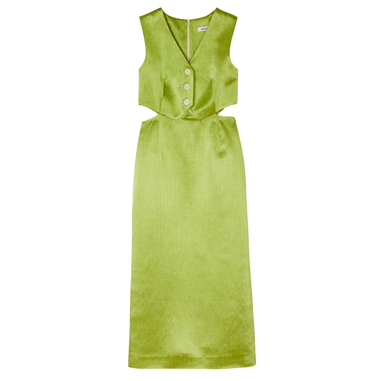 如果不想穿爛大街的黑白灰基本款,這件緞面材質的青蘋果綠背心長洋裝更是迷人得讓人想立刻收進衣櫃!西裝領背心加上窄裙設計不但不服貼,還多了一種隨性感,腰間鏤空設計同樣是添增女人味的小心機巧思。