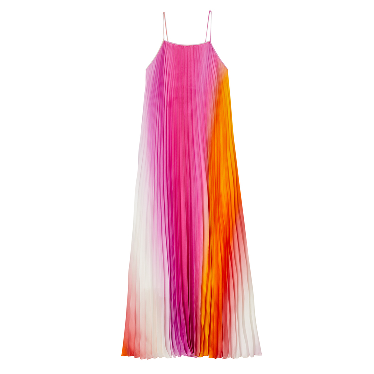 有試過把畫穿在身上的感覺嗎?這件粉色漸層褶皺洋裝直接把法國蔚藍海岸的絕美夕陽帶進衣櫃,從白色、粉色、桃粉到橘黃的漸層加上褶皺設計,讓你走在路上就像行走的藝術品,穿去度假絕對是當天最美的風景。