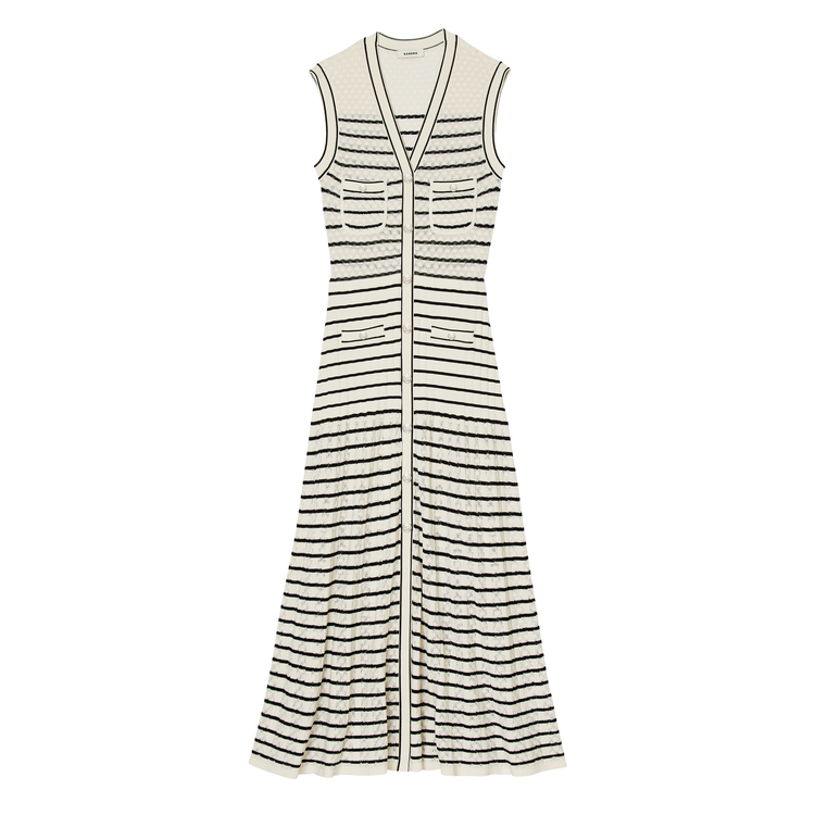 說到法式穿搭的基本元素,相信不少人會立刻聯想到簡約又有型的條紋,這件米白色條紋無袖長洋裝 V 領加上收腰的設計,屏除掉穿條紋容易顯胖的危機,從領口到袖口的滾邊設計,也都讓整件呈現青春無敵的學院感,換上視覺年齡立刻先 -5!